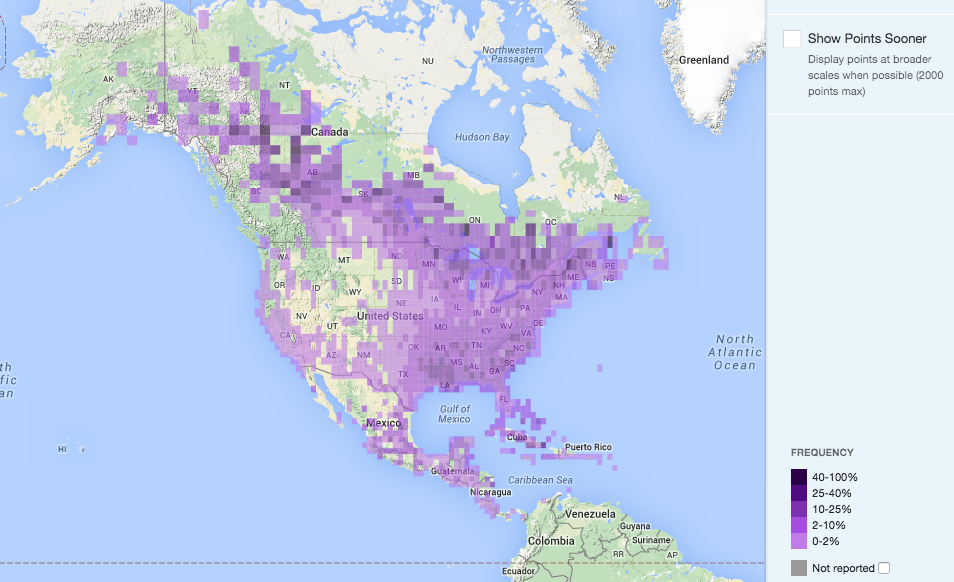 Purple blocks show the frequency of checklists reporting the species in that region, refer to the lower right corner of the image for more details.