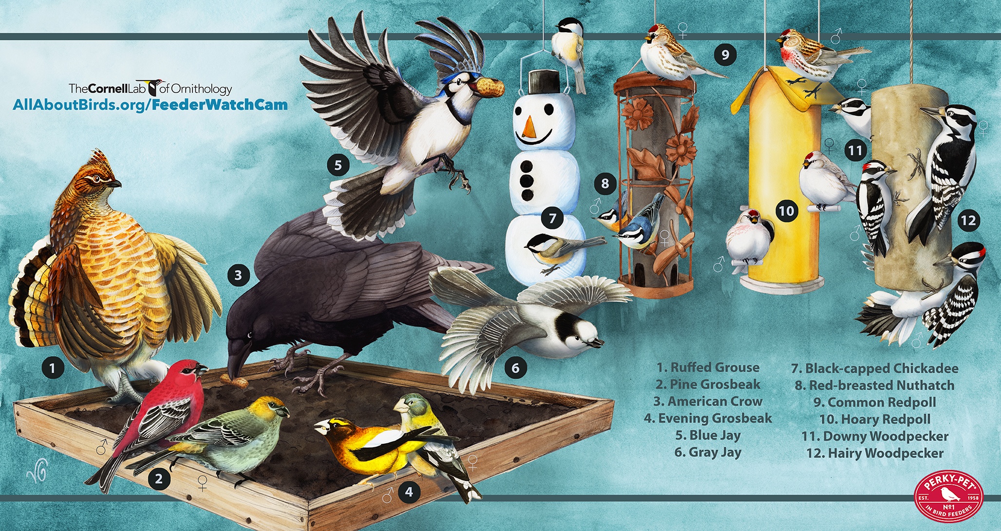 Decorate your desktop with a beautiful illustration by Virginia Greene inspired by the species and the scene featured on the Ontario FeederWatch Cam! Click on the image below to download your desktop wallpaper. Then, right-click on the image, select "Save As," and save the image to your computer.